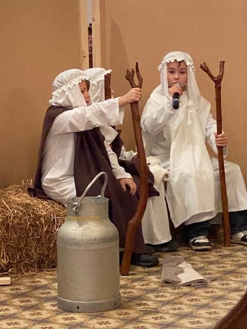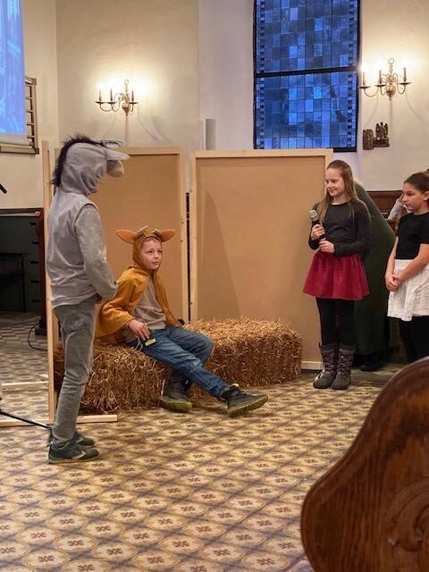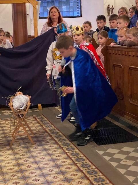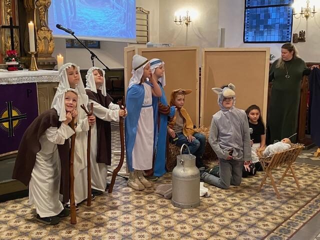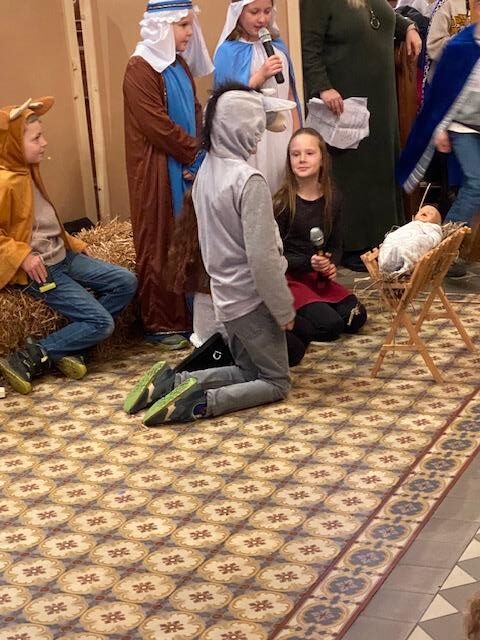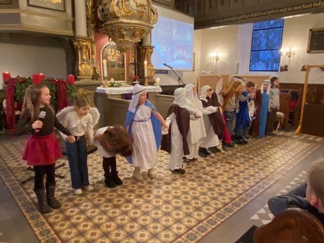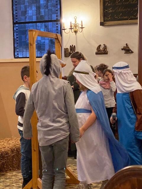 Aufgeregt warteten die Kinder der Theater-AG heute Morgen mit ihren Leiterinnen Frau Witteler, Frau Hofmann und Frau Brosy in der Servatiuskirche auf ihren Auftritt. Innerhalb des traditionellen Schulgottesdienstes vor den Weihnachtsferien führten sie ein Krippenspiel auf und transportierten damit die Weihnachtsbotschaft.